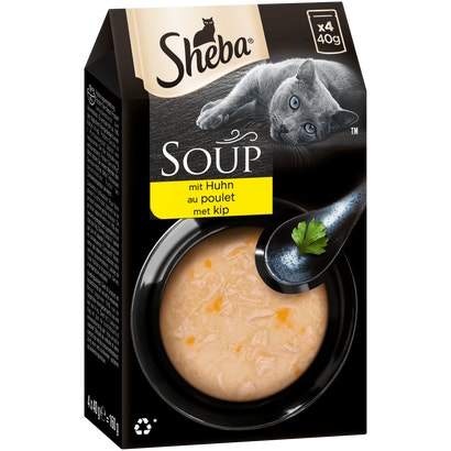 Eine köstliche Suppe aus feinsten Stückchen mit Fisch oder Fleisch in einer klaren Brühe. Eine unwiderstehliche Rezeptur, die das Verlangen deiner Katze nach einem neuen Geschmackserlebnis weckt. SHEBA® Suppen sind erhältlich in einer innovativen sowie attraktiven transparenten Verpackung – und sind so rein, dass deine Katze danach schnurren wird.